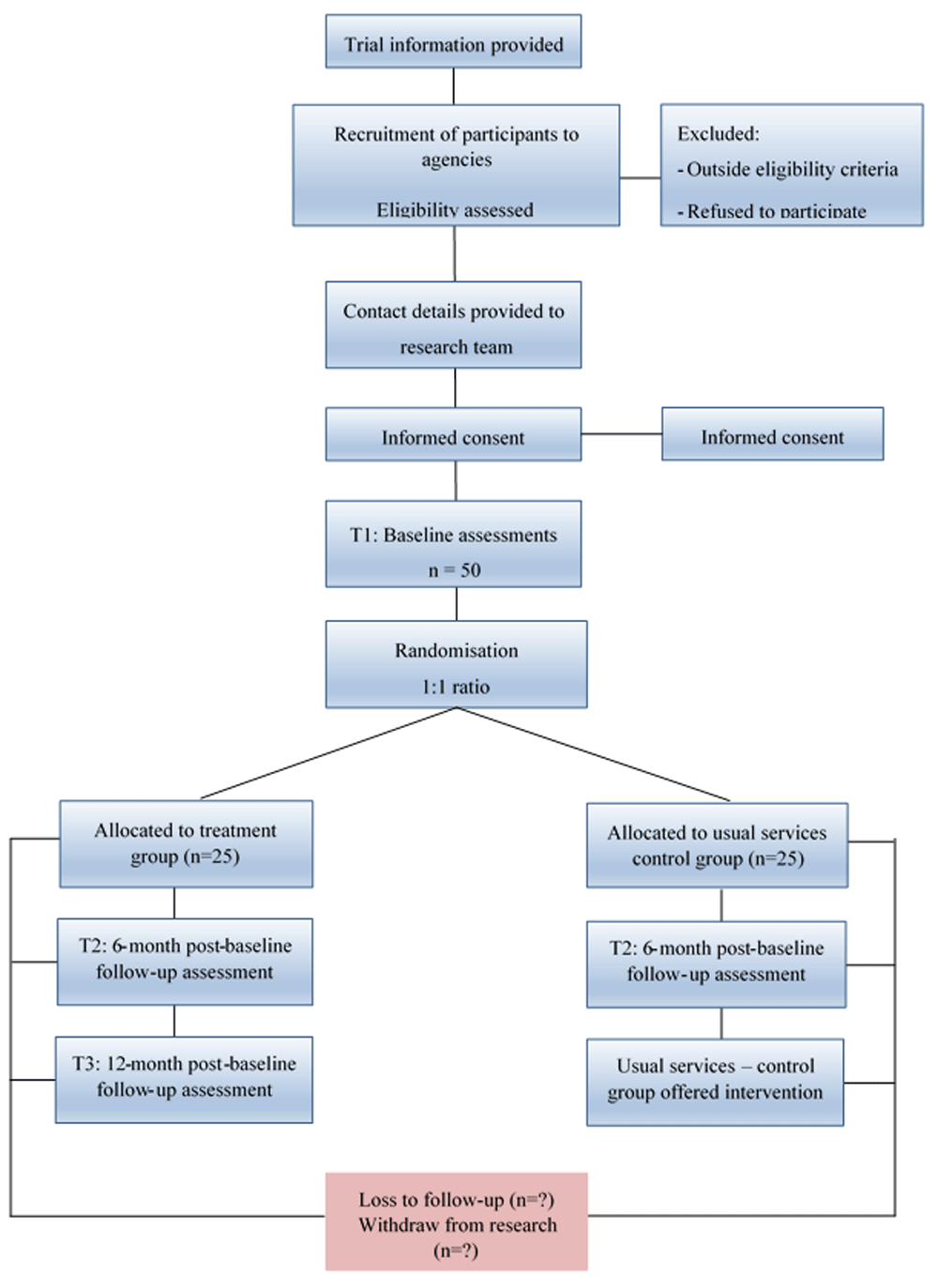 We aim to recruit approximately 50 families over a period of 24 months (2015–2017) at the two participating centres. Referrals of potentially eligible families will be accessed through existing waitlists within each site, as well as through liaison with a range of other statutory and community-based services in the area, who may also refer potential participants to the participating sites. Voluntary self-referrals will be accepted if the participating site deems that the family meets the inclusion criteria for the study. Many of the families involved in the study will most likely have an allocated social worker. Each site will meet with eligible families to discuss the intervention and the research evaluation. Families will be given a brief information sheet inviting them to receive further information about the study, and requesting that they provide their consent to forward their contact details to the research team. Participants will then be contacted by telephone to arrange for the research interviewer to visit them at home and to inform them about the study and obtain their written informed consent. Written informed consent will be obtained before any study-specific procedures, including collection of baseline data. Families will be thanked for their time e and given a shopping voucher worth €20 at each data-collection visit. Collectively, the research team have considerable experience of working with vulnerable and difficult-to-engage populations and their expertise, in conjunction with the advice and support of the collaborators, will be important in managing the recruitment process.