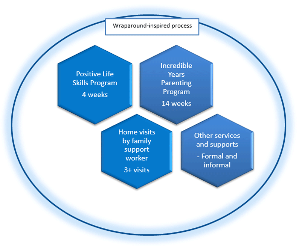 While significant progress was made in the implementation of Meitheal within Ireland during 2016 (Cassidy et al., 2016), it has not yet been sufficiently embedded to have allowed time to restructure the current intervention within its wraparound framework. Therefore, the wraparound-inspired model to be evaluated in this study (and described below) was developed at an earlier stage (2012 to 2014) than Meitheal and does not contain all WA elements as indicated in the NWI. While it is similar to the NWI wraparound model in terms of utilizing a family-focussed, multi-disciplinary, tailored approach to meet the multiple needs of families, it is different in two important ways. Firstly, there is less flexibility and choice in the current model, as it comprises core components of home visits, parent training and a positive life skills programme (as well as any other supports desired by families). Therefore, the model is targeted towards those families whose needs are best met by such programmes and who agree to engage with them. The US (and Meitheal) model, on the other hand, does not require any mandatory component and allows the family to select any service provider on their team. Secondly, the current model does not involve formal team meetings in which the family and selected service providers are present; rather the family collaborates with a caseworker to produce a coordinated plan of care that is tailored to meet family needs. The plan will include the core components as well as any other requested supports, although access to the latter may depend on availability. Therefore, the current intervention involves an intensive package of supports for families that has been inspired by a wraparound philosophy of care but is not identical to it.
