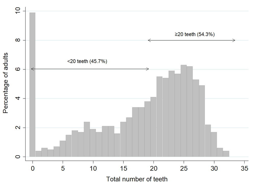 (Base edentate/dentate, n=2504). Mean number of teeth was 17.9, SD = 8.9, Median=21.