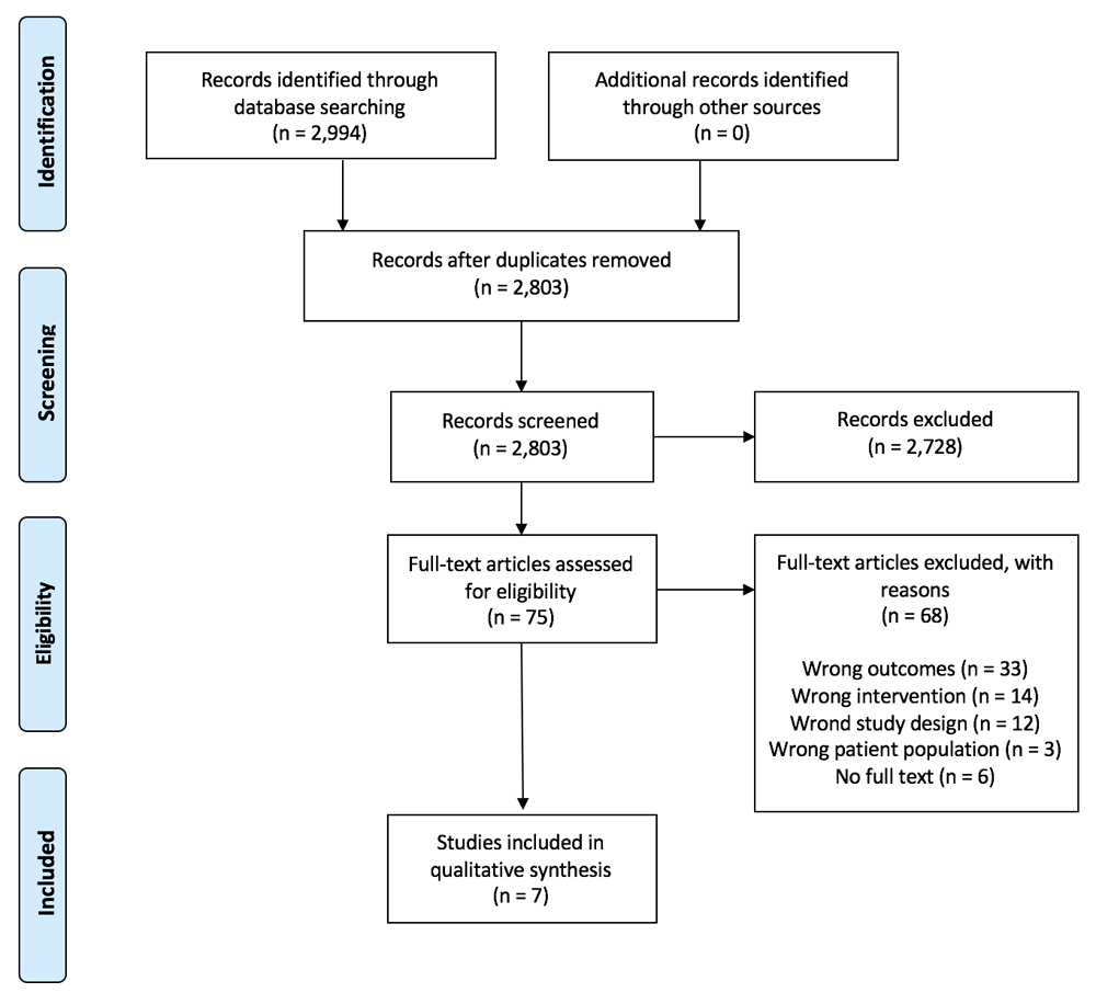 The PRISMA flow diagram outlines study selection (Figure 1). A total of 2,994 articles were retrieved and 191 duplicates were removed. Following title and abstract screening, 2,728 articles were excluded leaving 75 full-text articles to be screened. Ultimately, seven articles were included in this review. Types of studies were mixed, including RCTs (n=3) and observational studies (n=4). Table 1 describes the methodological features of included studies.