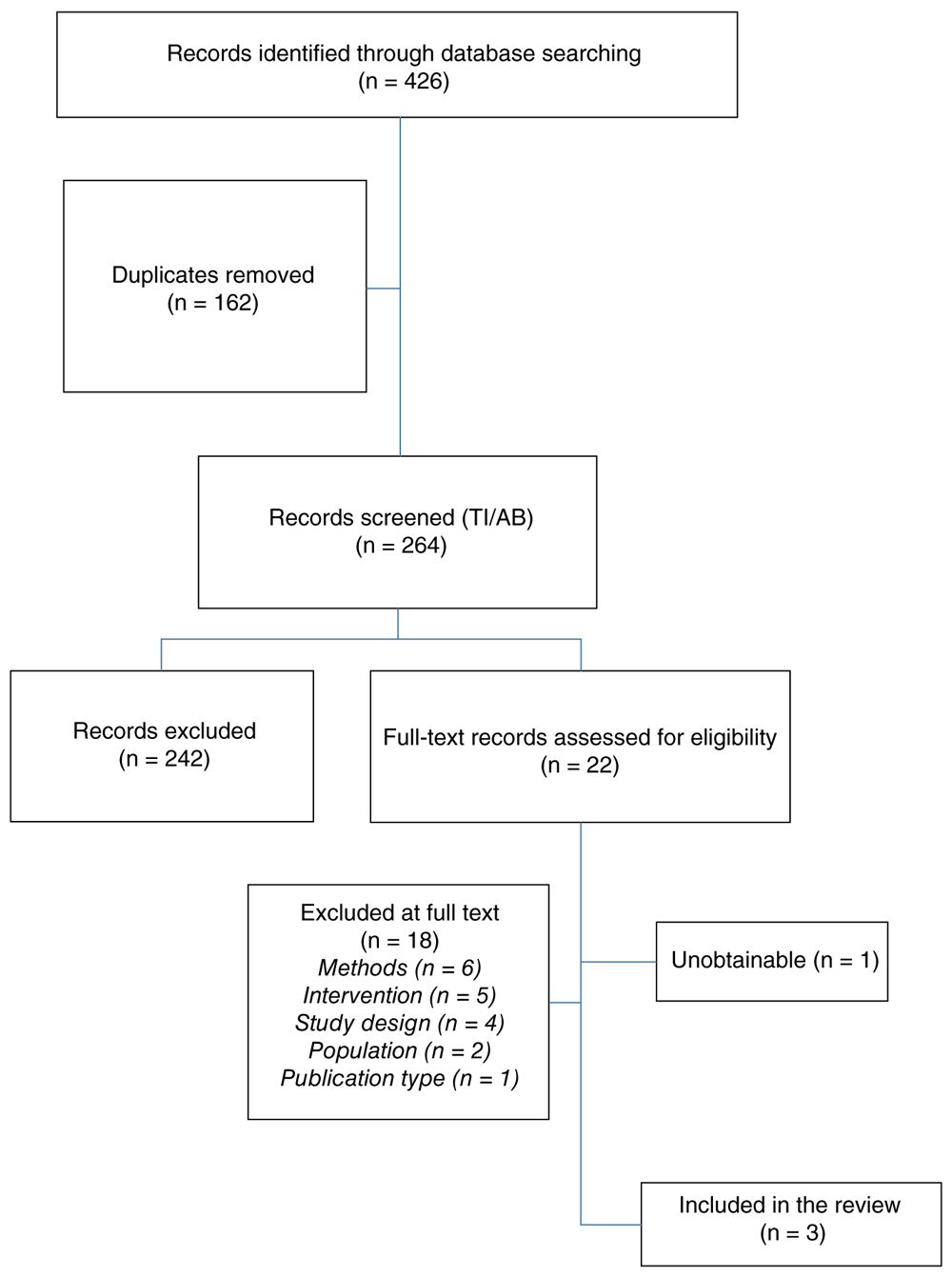 The database search identified 426 citations for consideration against the eligibility criteria for this review. Following removal of duplicates (n=162), 264 unique citations were forwarded for title and abstract screening. Of these, 242 citations were excluded based on title and abstract, as they clearly did not meet the review’s pre-specified eligibility criteria. A full-text review of the remaining 22 citations was performed, following which a further 18 citations were excluded and one32 was unobtainable. We corresponded via email with the author of the unobtainable text, who confirmed she did not have access to a copy of the manuscript and was not able to source one.