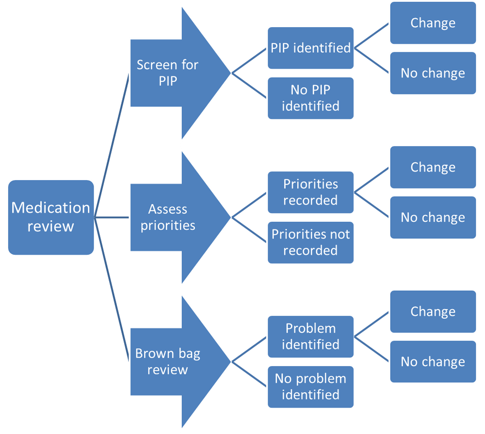 The purpose of the brown bag medication review is to incorporate the patient’s ideas and concerns about their medicines and to identify and deprescribe medicines that may not constitute high risk PIP but are inappropriate none the less as they are ineffective or have risks that outweigh benefits in the particular individual. Qualitative work with doctors has highlighted several barriers to deprescribing, including feasibility issues, prescriber confidence and prioritization (or lack of) of deprescribing17. However qualitative work with patients indicates that most would be agreeable to deprescribing medication if supported by their GP18. These more nuanced areas of doctor and patient attitudes to deprescribing will be explored qualitatively in the process evaluation.
