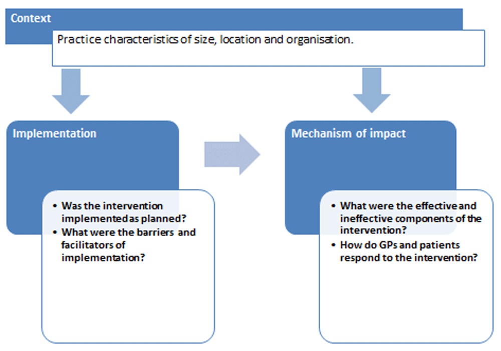 Complex interventions involve a number of interacting components and often offer a degree of flexibility, or tailoring to the local environment1. Therefore, it is often difficult to ascertain why a complex intervention was or was not effective, and if effective, what components of the intervention were responsible for that effect. The Medical Research Council (MRC) advise performing a process evaluation alongside the effectiveness evaluation of a complex intervention to assess how it was implemented, how it caused change and how the intervention interacted with the context in which it was implemented2. This provides important information for policy makers on how a complex intervention might be implemented more widely into the healthcare system. A framework to guide process evaluations designed for cluster randomised controlled trials3 advises that process evaluations should clearly state their purpose and research questions and as recommended by the MRC guideline, this paper sets out to pre-specify our process evaluation research questions and methods.