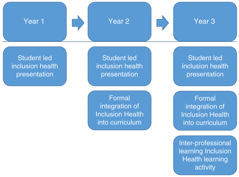 Figure 1. Step-wise approach of developing suite of inclusion health learning activities from Year 1 (Academic year 2018–2019) projected to Year 2 (Academic Year 2019–2020) and Year 3 (2020–2021) into formal undergraduate curriculum.