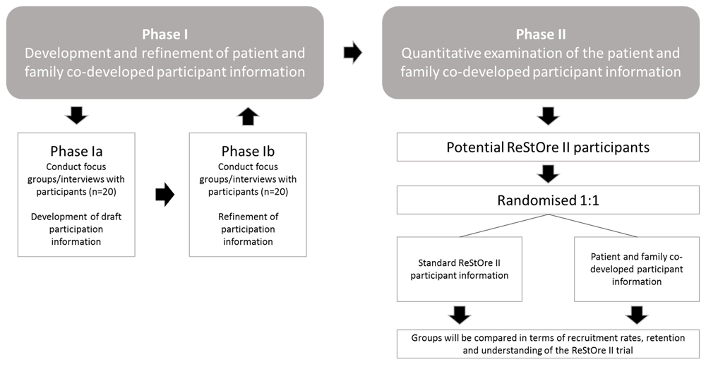 The study is divided into two phases; Phase I (development) and Phase II (evaluation). The study design is presented in Figure 1. Phase I will utilise qualitative methods to develop and refine the patient and family co-developed participant information. In Phase II, the patient and family co-developed participant information will be compared to standard participation information by a randomised controlled trial embedded within the ReStOre II randomised controlled trial.