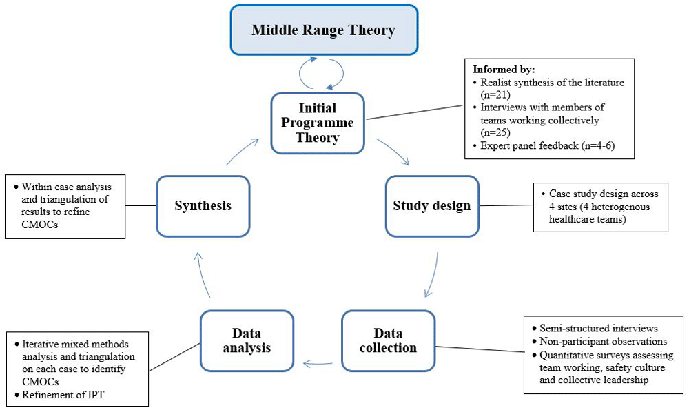 Expert panel discussions. To further advance and refine the IPT, a panel will be convened to gather the views of programme designers and experts in the fields of collective leadership, team working, and patient safety. The expert panel (n=4-6) will assist the research team in refining and finalising the IPT, and, if necessary, prioritising CMOCs for testing. The IPT will also be presented to a panel of researchers experienced in realist evaluation methodology to confirm plausibility and for refinement before it is finalised for testing. This programme theory will be tested and further developed through the subsequent stages of the realist evaluation process.