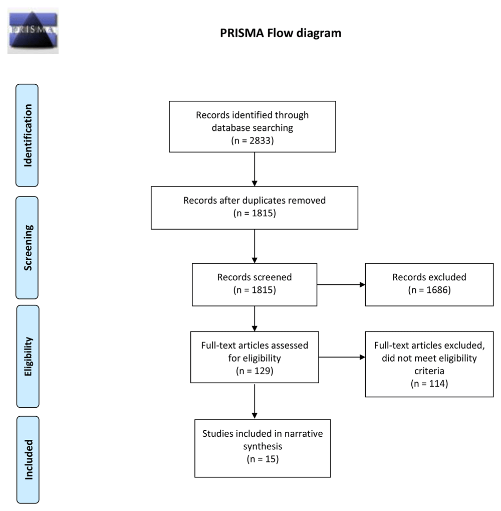 After the removal of duplicates, 2832 studies were identified. After full-text screening, a total of 15 studies were deemed eligible for inclusion in this review. The PRISMA flow chart24 summarizes the search strategy (Figure 1). Quantitative (n=11) studies predominated and the remaining were qualitative in design (n=4). Over 2000 participants were included in this review (n=2,018). Over 70% of participants were male. Four studies were limited to male only participants25–28, while only two were female only29,30. Characteristics of the included studies are shown in Table 1. The majority of studies took place in North America (12/15) with the remainder in Australia (n=1) and Denmark (n=2).