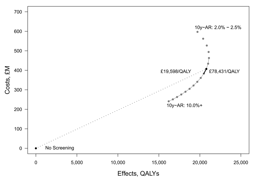 The non-mutually exclusive strategies within Callender et al.1 means the incremental CERs reported in Table 1 correspond to a mixture of different policy choices for men of different lifetime risk. For example, reducing the risk threshold will bring forward the age of first screening for men of high lifetime risk, while it may entail a shift from no screening to one or more screens for a man of lower lifetime risk. While both men may have an equal 10y-AR at the initiation of screening, the differences in both their lifetime risk and the number of lifetime screens they receive mean the policy choices will likely be of different cost-effectiveness. There is no way to disaggregate the published results into a form that would permit policy makers to understand how large any differences in cost-effectiveness may be between men of different lifetime risk or identify what the optimal policies would be.