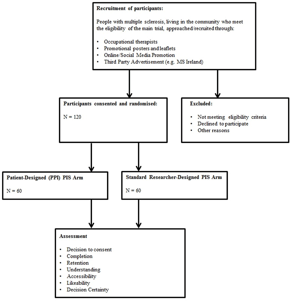 PwMS will be recruited through advertisement in relevant outlets, including newsletters and other publications (e.g. monthly MS Ireland newsletter), MS-related websites, discussion boards and forums (e.g. MS Ireland), recruited occupational therapists, posters in relevant clinics around the Republic of Ireland (e.g. GP, primary care clinics, physiotherapy and neurology), radio and social media. Advertisements (see Extended data; Dwyer, 2020) will not provide detailed trial information that would contaminate or influence assimilation via the PISs. Individuals interested in participating will self-select through contacting the researchers by email or phone; and informed consent will be obtained prior to participation.
