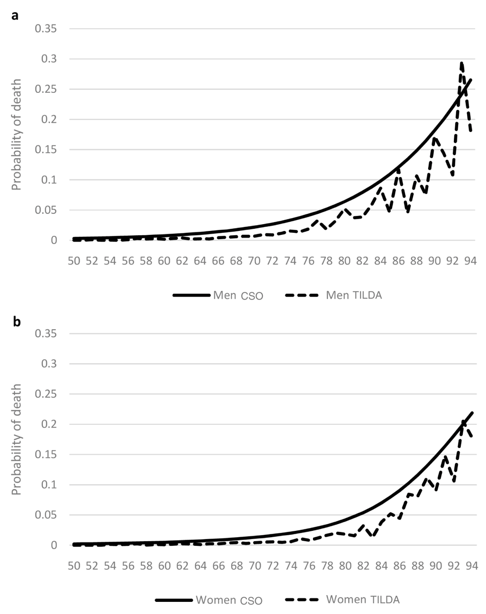 Comparison with life tables from the CSO showed that mortality rates among younger participants closely aligned with those in the wider population. While TILDA mortality rates were lower in the older age groups, this divergence is unsurprising given that the TILDA sample was drawn from adults living in the community which means that they were on average healthier than the total population of older adults. Furthermore, this pattern is similar to that reported from the Health and Retirement Study (Weir, 2016).