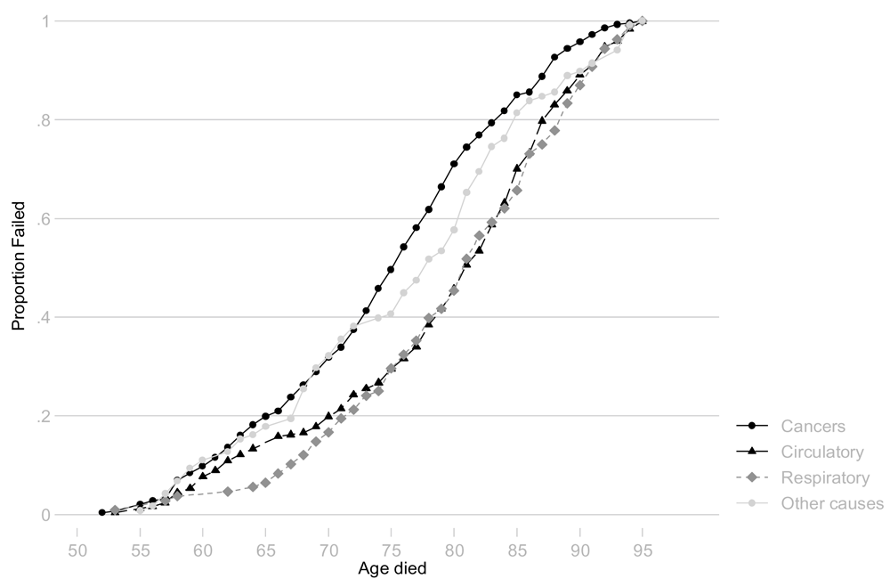 Figure 2 shows the cause-specific failure curves for the major disease groups which highlight important differences. There were fewer deaths due to diseases of the respiratory system, particularly before the 70 years of age. Most of the deaths before this age occurred due to neoplasms and other causes including accidental deaths. After 70 years, a similar pattern was observed for diseases of the circulatory and respiratory system while neoplasms accounted for the greatest number of deaths.