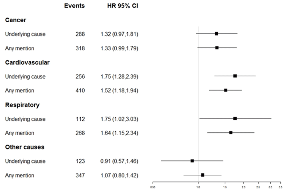 To assess the utility of contributory cause of death versus underlying cause, Figure 3 shows the sex-adjusted hazard ratios for smoking as a risk factor for cause-specific mortality according to both underlying and contributory (any mention) cause of death. In each instance, we observed similar estimates whether we assigned death due to an underlying or contributory cause.
