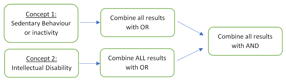 The search strategy was refined into two concepts following the application of PICo. Concept 1 is ‘Sedentary behaviour or inactivity’ and Concept 2 is ‘Intellectual Disability’. Each of the two concepts will be searched using MESH terms and keywords and then combined using OR. Then the total results of each concept will be combined using AND (See Figure 1). This search will be repeated for each of the four databases. The resulting article list will be the complete combined database search results. This list will be screened for inclusion.