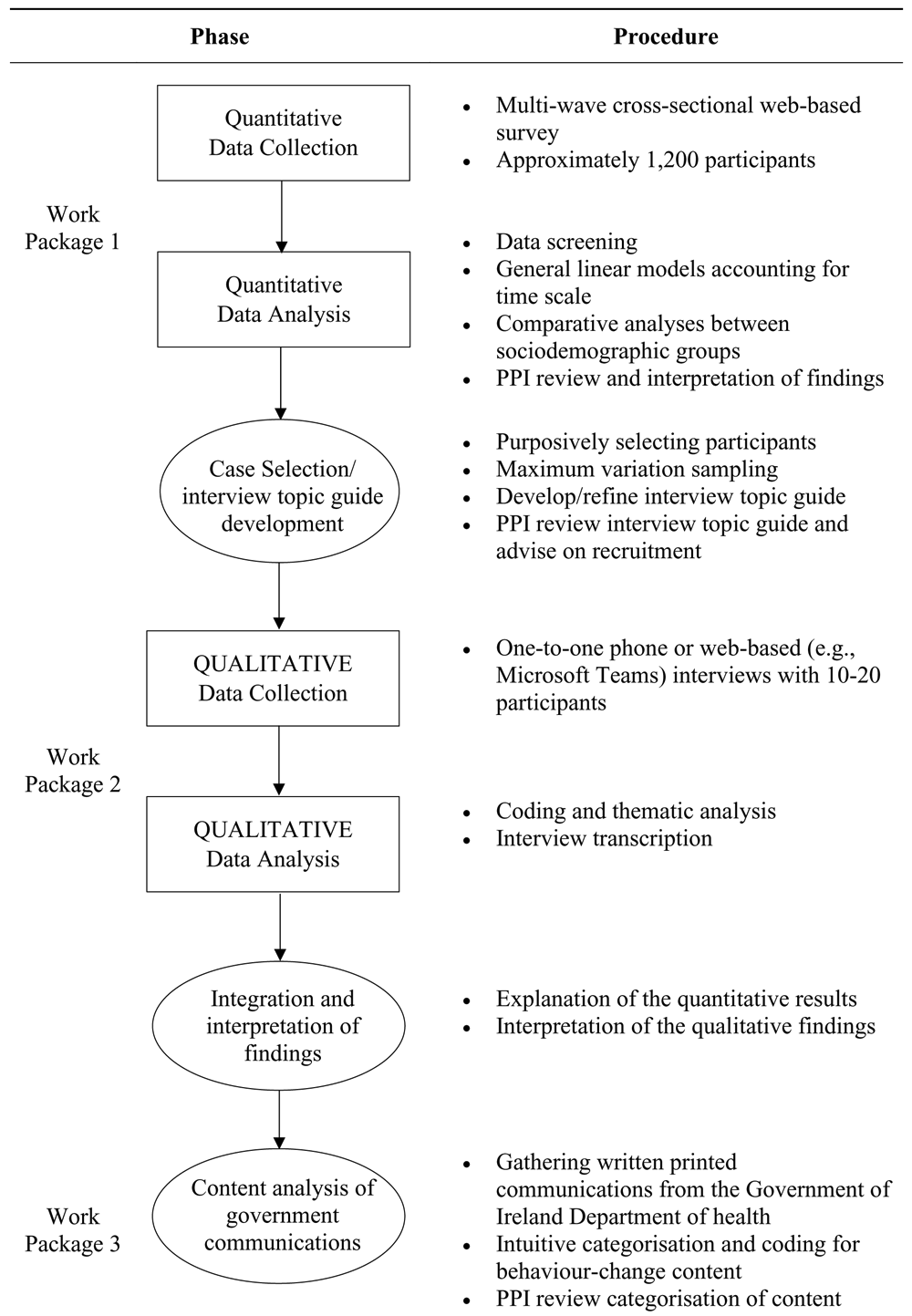 Key national stakeholders. Dissemination and knowledge exchange will be promoted from the outset through involvement of key national policy partners from the DoH (RM and KOF) and PPI panel members as advisors in conduct of the research. Research outputs will be disseminated, translated, and shared primarily via the NPHET COVID-19 Communications and Behavioural Advisory Group, of which co-authors MB, RM, and KOF are members. The Communications and Behavioural Advisory Group publicly disseminates its findings via its website, which is regularly updated with reports and information. Any deliverables from the research will be promoted via social media channels, such as Twitter and Facebook.