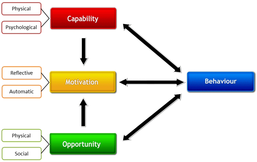 There are multiple possible psychosocial variables that are likely to account, in part, for the resistance to physical distancing-related behaviour change (Atchison et al., 2020; Williams et al., 2020; Wirz et al., 2020). These diverse factors can be usefully summarised by two complementary theoretical approaches: (1) the COM-B (Capability, Opportunity, Motivation-Behaviour) model (Michie et al., 2011); and (2) the Health Belief Model (Rosenstock et al., 1988), which, together, provide a framework for understanding the psychological, behavioural, social, and environmental factors that predict human behaviour change and adaptation. Foremost among the factors that are likely to include the public's beliefs about COVID-19 and about physical distancing as a countermeasure to reduce disease transmission. These illness and treatment beliefs (Hagger et al., 2017) about COVID-19 and physical distancing are likely to vary according to key demographics and membership of certain “at-risk” groups, for example, older age groups (Atchison et al., 2020) and people who are immunocompromised. In addition to these reflective cognitive factors, there are automatic psychological processes that are likely to make physical distancing behaviour difficult to adopt. For example, automatic responses to shake hands or to move into the close physical proximity of friends, neighbours and colleagues when we see them are difficult to inhibit, given that they are largely non-conscious behaviours that have become highly habitualised (Hollands et al., 2016; Marteau et al., 2012).