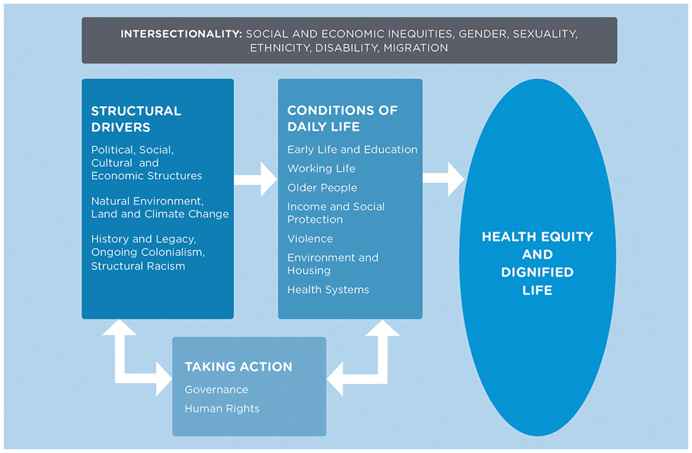 In 2018, Sir Marmot presiding over the Pan American Health Organization’s (PAHO) Commission on Equity and Health Inequalities in the Americas report, expanded the SDH framework to include structural drivers (e.g. institutional racism) and the intersection of various drivers as factors which adversely increase the experience of the social determinants of health, see Figure 112.