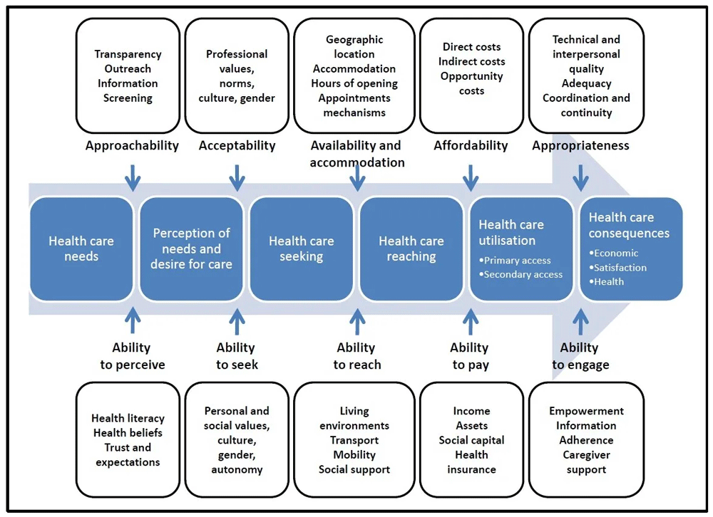 Structural drivers, or structural violence, is a term coined by anthropologists, which describes how oppressive social structures or institutions can result in death, injury, illness, subjugation, stigmatization, and even psychological terror for specific social groups or populations13. Structural factors are borne out as determinants in the brain health literature, such as level of education attainment, which is impacted by many factors, including the quality of education. For example, in the United States, schools in the South were racially segregated up to 1954, with schools for African American students on average receiving fewer resources (e.g. shorter school term length, higher pupil-teacher ratio) than schools for white students14. Attendance at schools in southern states was subsequently found to be associated with years of completed education and late-life cognitive decline14. Structural factors are also important in the context of healthcare systems which can also influence health outcomes. For example, long waiting times in the Emergency Department can be a barrier for individuals with addiction issues or attention deficit hyperactivity disorder, common within the homeless population15. Access to health care is defined as the opportunity to reach and obtain appropriate health care services in situations of perceived need for care16. Components of access include ‘approachability’ (people can identify their health needs and the services needed to meet these needs) ‘acceptability’ (people accept the socio-cultural aspects of the service); ‘availability’ (an adequate supply of services relative to needs); ‘accommodation’ (health services can be reached both physically and in a timely manner); ‘affordability’ (the in/direct cost implications to the person in relation to need); and ‘appropriateness’ (fit between services and person’s needs), see Figure 216.