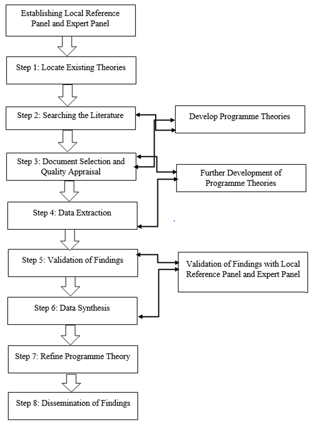 The final stage involves the refining and testing of the programme theory, following synthesis of the data. It is envisaged that the programme theory will explain how and why QCP-M’s produce outcomes from changes in contexts and their resultant interactions with mechanisms. The local reference and expert panel will assist in refining the final theory by providing us with their expertise in the field. After completing all steps in this review, any stage may be revisited in order to ensure data saturation and ‘theory saturation’21. Once the review has been deemed to have reached data and theory saturation, no further documents will be added, and steps will not be repeated.