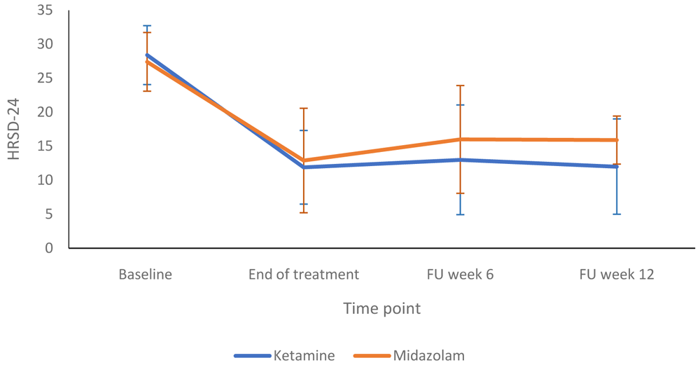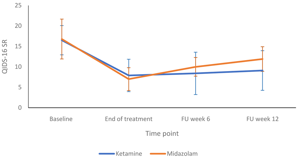 FU, follow-up. Number of participants at each stage: Baseline - Ketamine n=13, Midazolam n=12; End of treatment - Ketamine n=11, Midazolam n=12; Follow-up at 6 weeks - Ketamine n=9, Midazolam n=9; Follow-up at 12 weeks - Ketamine n=10, Midazolam n=9.