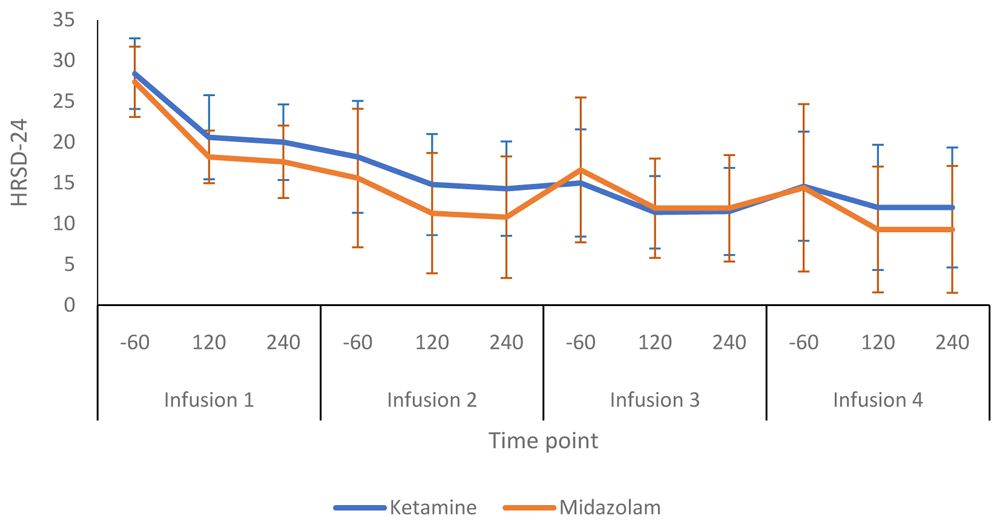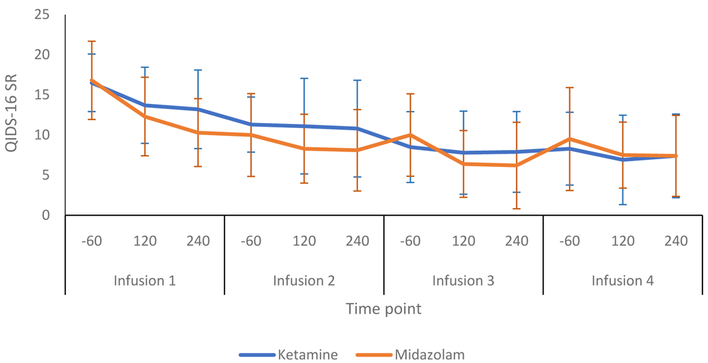 Eligible participants were inpatient ≥18 years old, being treated for an acute depressive episode and met DSM-5 criteria for major depressive disorder (MDD) or bipolar affective disorder (current episode depression) and scored ≥21 on the 24-item Hamilton Rating Scale for Depression (HRSD-24). To be eligible for inclusion, subjects must have met each of the above criteria at screening and baseline assessments. Exclusion criteria were current involuntary admission, active suicidal intention, dementia, history of Axis 1 diagnosis other than a major depressive episode, ECT administered within the last two months, a Montreal Cognitive Assessment (MoCA) score <24, alcohol/substance dependence in the previous six months, pregnancy or inability to confirm use of adequate contraception during the trial, breastfeeding women and any medical condition rendering the patient unfit for ketamine/midazolam. Contraindications to ketamine, as per summary of product characteristics, included hypersensitivity to the active substance, uncontrolled hypertension, severe coronary or myocardial disease, cerebrovascular accident and cerebral trauma. Contraindications to midazolam included known hypersensitivity to benzodiazepines, severe respiratory failure or acute respiratory depression. All candidates meeting any of the exclusion criteria at screening/baseline were excluded from study participation.
