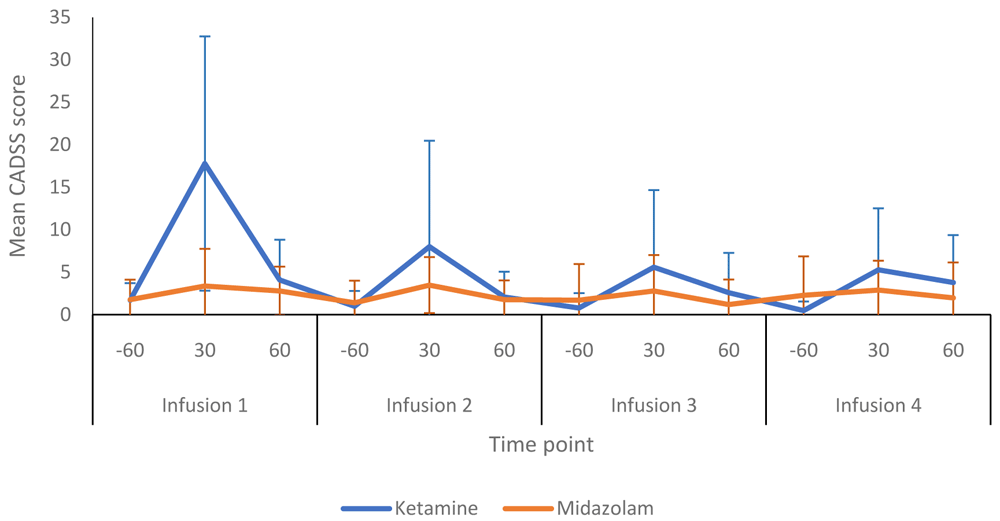 Several instruments were used before, during and after infusion sessions to assess for psychotomimetic side-effects. Figure 6 summarises the CADSS dissociative symptom scores obtained from the ketamine and midazolam groups at various time points during infusion sessions. Participants receiving ketamine tended to score higher than those in the midazolam group. During the first infusion, the mean CADSS score (at 30 minutes) was 17.8 (15.0) in the ketamine group and 3.4 (4.4) in the midazolam group. The peak CADSS scores within the ketamine group declined with each subsequent infusion session and returned towards pre-infusion levels at the +60 minute time point (i.e. 20 minutes after infusions finished) for each of the four infusions sessions (Table 3). Psychosis (BPRS) and mania (YMRS) scores are shown in Table 3. No participants in either group experienced psychosis or elevated mood during any of the infusion sessions.