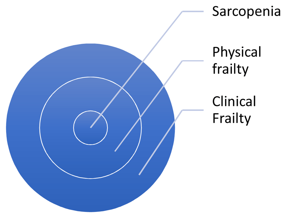 On the other hand, physical frailty status is a narrower concept based on unexplained weight loss, self-reported exhaustion, weakness (by grip strength), slowness (by gait speed) and low levels of self-reported physical activity9. Researchers have adapted the physical frailty definition to allow the provision of a continuous score (e.g. SHARE-FI10). A core component of the physical frailty phenotype is the diagnosis of sarcopenia, which has been operationalised by consensus11 and objectively measured with bioelectrical impedance analysis. Figure 1 shows the conceptual framework of the different frailty operationalisations used in this study.