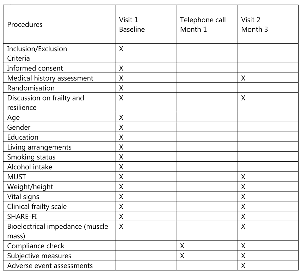 Baseline measurements for all recruited patients will be: age, sex, education, living arrangement (alone, with others), smoking status, alcohol intake, blood pressure, heart rate, BMI (weight and height), comorbidities, malnutrition universal screening tool (MUST), CFS, SHARE-FI (which includes handgrip strength) and bioelectrical impedance for muscle mass.