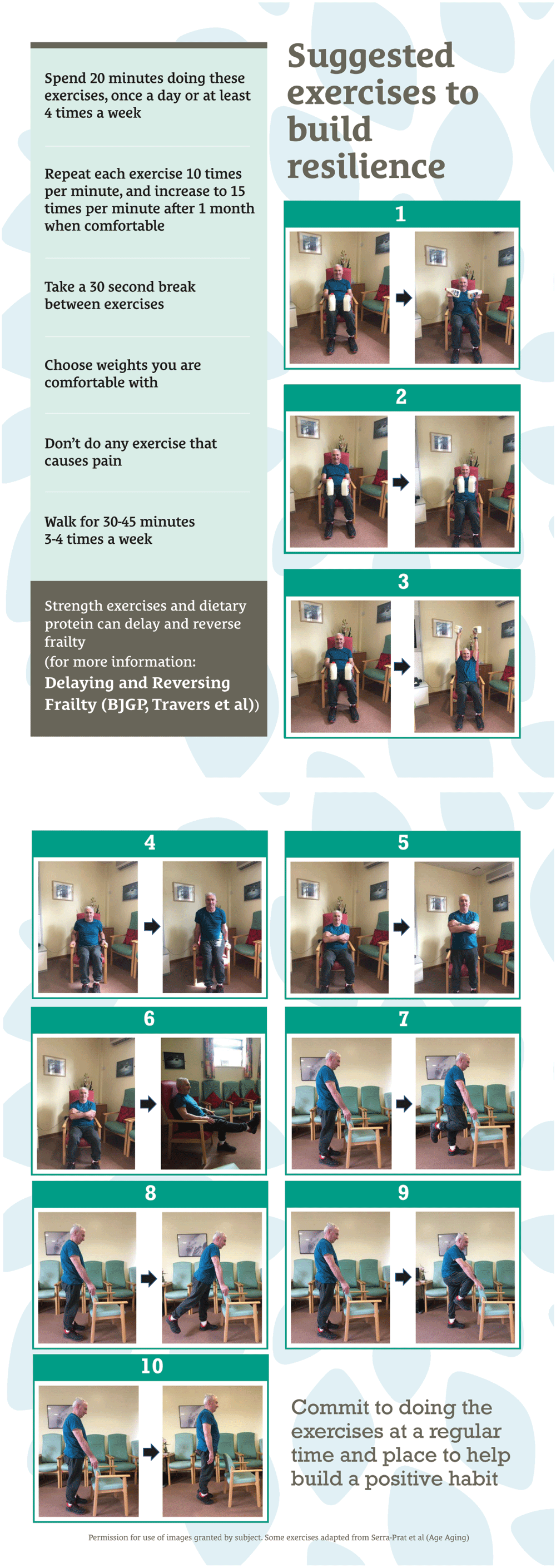Resistance training done at home and protein supplementation have been shown to be the most effective and easiest to implement interventions to reverse frailty and build resilience. However, it is not common practice to offer and support such interventions in primary care.