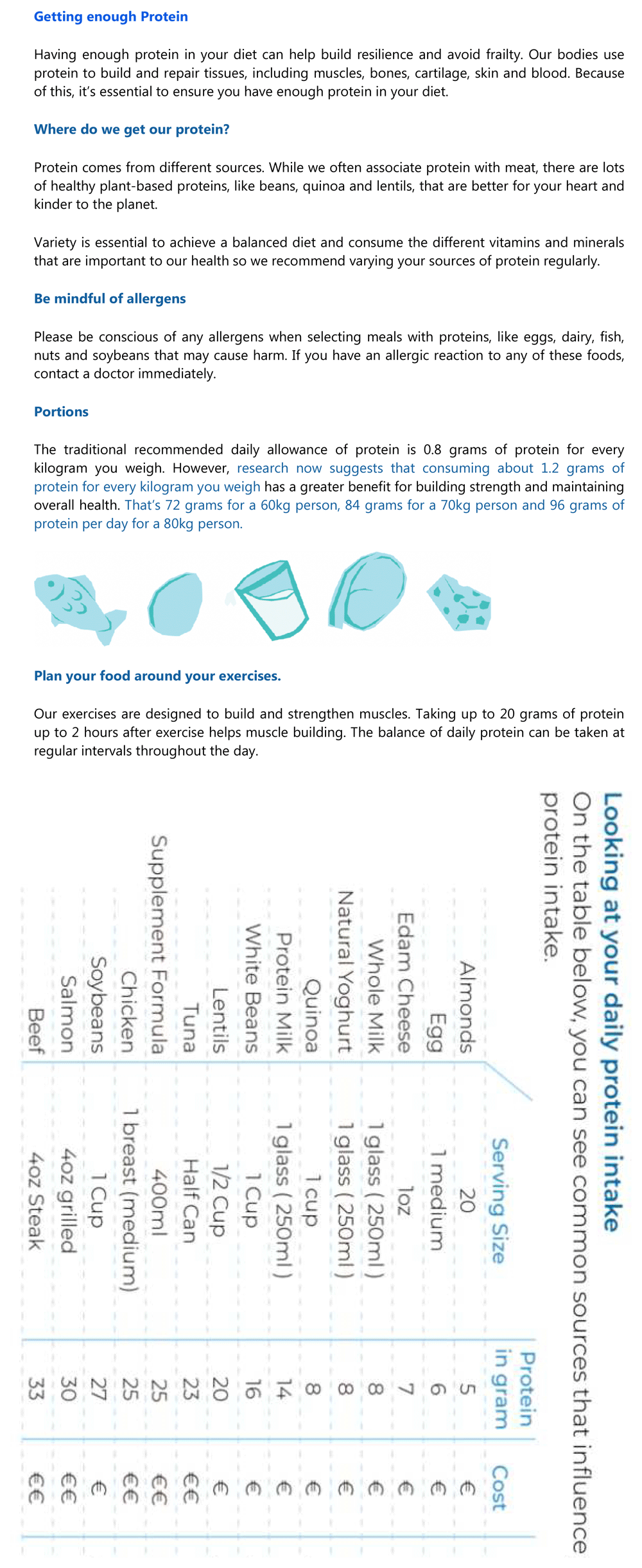The resistance exercise regime consists of ten, home-based, physical exercises as illustrated in an accompanying leaflet. Each exercise is to be repeated ten times in one minute, increased to fifteen times per minute after about 1 month, when comfortable. A break of 30 seconds is to be taken between sets of exercises. Exercises are to be undertaken at least four times per week and up to every day. Participants should also walk for 30 to 45 minutes, three to four times per week. Participants are advised to consume 1.2 g protein per kg body weight each day. A leaflet will be provided with information on sources of protein, amounts of protein per typical serving and suggested meals. A sample exercise leaflet and protein dietary guidance are shown in Figure 4 and Figure 5.