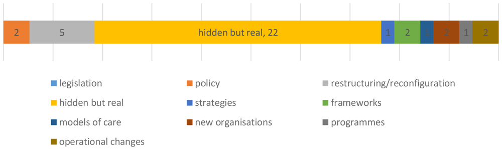 These outcomes can be attributed, at least in part, to poor clarity about, and commitment to the reorganising mechanisms employed. This has hindered the identification and evaluation of outcomes. Where explicit mechanisms including new structures are highlighted (in policy and planning documents), their meaningfulness often gets lost in lagging implementation. Our findings indicate a failure of system learning so that effective reorganisation when needed remains elusive. Despite the evidence from the international literature that the mechanisms driving change are often implicit and ‘soft’ in nature, learning to work with meaningful engagement, participation, cultural and political nuance seems a profound challenge. Our interview respondents report that the enduring outcome of reorganisation work since 1990 in Ireland is a series of ‘unresolved conversations’ rather than an identifiable learning path.