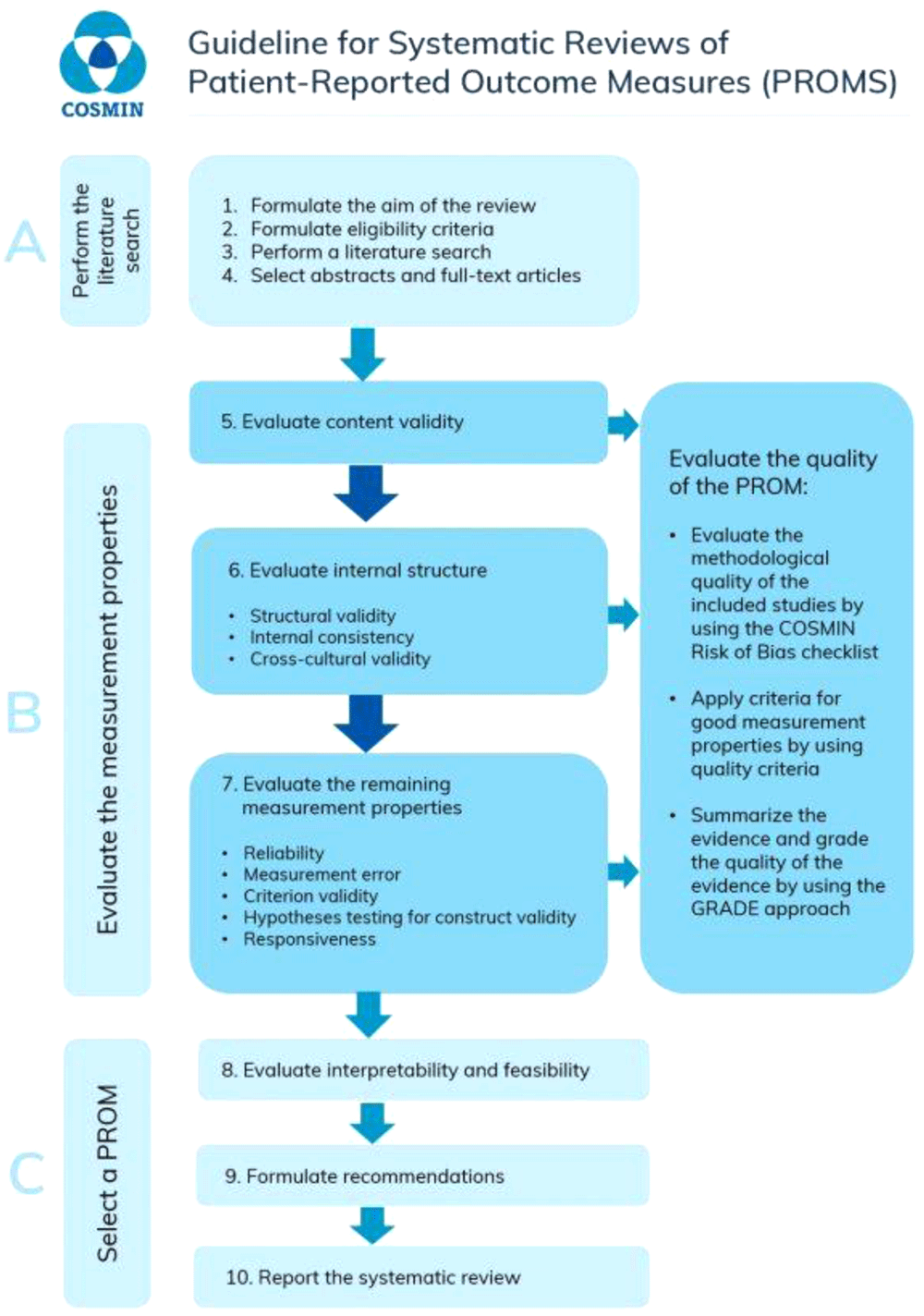 PRISMA-P guidelines and COSMIN guidelines for systematic reviews will be followed with the following steps being used to evaluate potential PROM17. These are a ten-step process as described in Figure 1.