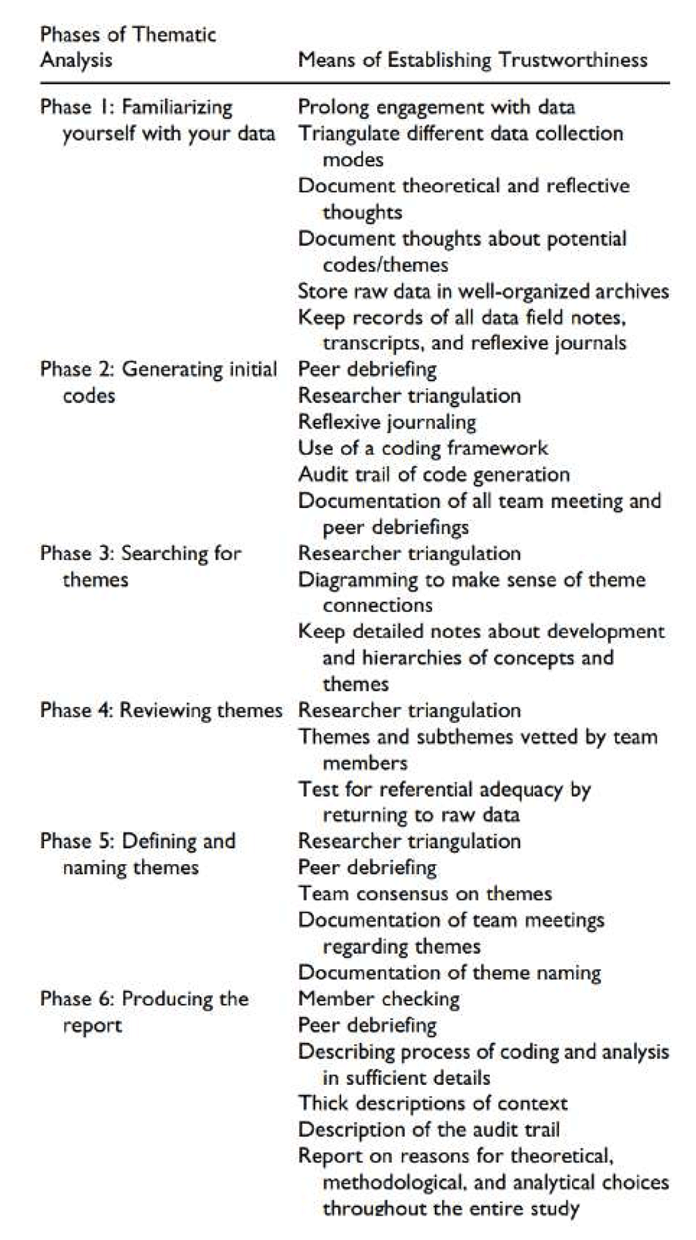 The transcriptions of each interview will be analyzed by two members of the research team (NB and BD). Where there is uncertainty or disagreement, a third member of the research team will be asked to contribute to the data analysis. Data collection and analysis will happen concurrently. Analysis will begin directly after each focus group is completed. A six-phase process of thematic analysis will be carried out to identify “patterns or themes within data,” (Table 1)59. We will also be guided by a framework described by Nowell et al.58 to ensure trustworthiness in thematic analysis (Figure 1). This framework aims to achieve trustworthiness as described by Lincoln and Guba60 as credibility, transferability, dependability, and confirmability60.