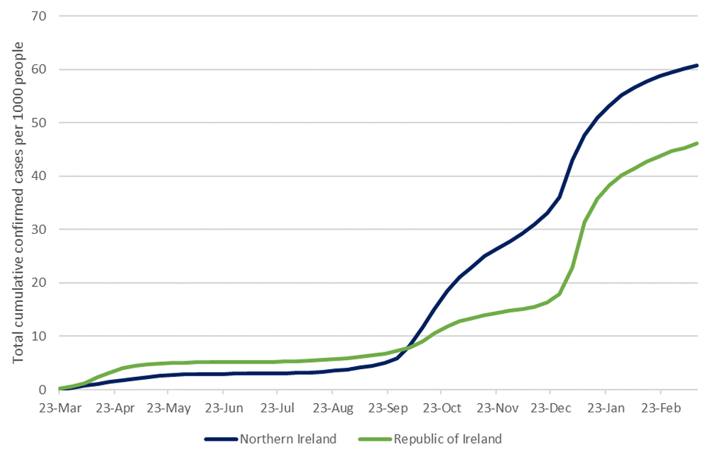 The ROI has a centralised government in the capital city, Dublin. In NI, legislative responsibility rests with the Stormont Executive in Belfast, which has powers on health and a wide range of other policy matters devolved from the UK government in London. Each made decisions to control spread of the virus through 2020. The first cases of COVID-19 on either side of the border were confirmed in late February 20205, and both governments initiated a wide-ranging lockdown of economic and societal activity to control this ‘first wave’6,7. Restrictions were eased through the summer and then tightened again in anticipation of a ‘second wave’ of cases in the autumn6,8. ROI responded more quickly to rising cases in August and September, and experienced a relatively modest “second wave6. In NI, Stormont officials prioritised co-ordination with London over Dublin and experienced among the highest per-capita rates in the world9. Both jurisdictions eased “second wave” restrictions at the end of November and witnessed a very significant “third wave”, mostly driven by the B.1.1.7 variant, which first emerged in southeastern England in September and was transmitted to both jurisdictions at a high rate as people travelled home to Ireland for the Christmas holidays10,11. Total weekly cases per 1000 people, illustrating similar rates until the second wave and a much higher rate of confirmed cases in NI since, are presented in Figure 212,13.