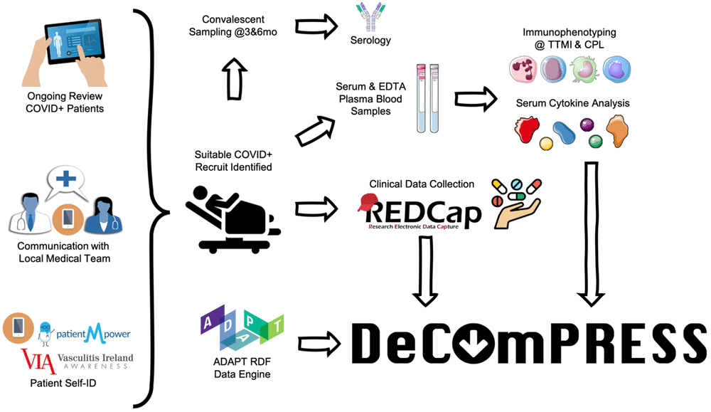 Patients from designated cohorts are recruited at local hospital sites and clinical data recorded in REDCap. Serum and EDTA plasma samples are taken for immunophenotyping and serum cytokine analysis at the Central Pathology Laboratory in St. James's Hospital. Repeat sampling at 3 and 6 months for convalescent antibody testing. Data will be incorporated into the ADAPT RDF data engine for subsequent analysis.