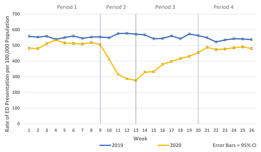 - ED presentation (Rate Difference -142.1 per 100,000 population, 95% CI, -150.4, -133.6, p-value <0.0001 and Rate Ratio 0.72, 95% CI 0.71, 0.73, p-value <0.0001)