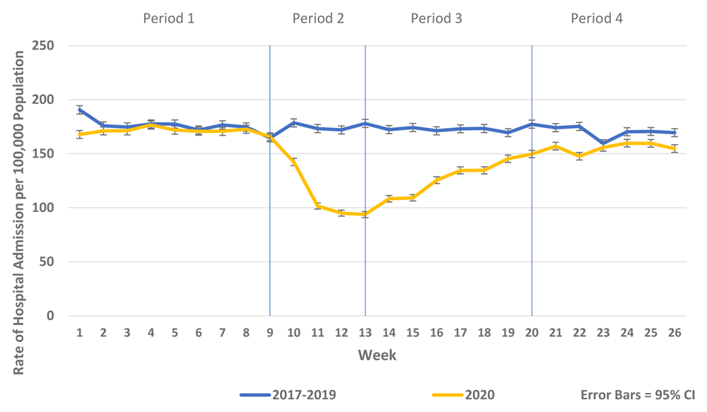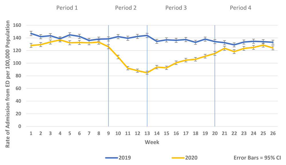 - Non-COVID-19 emergency hospital admission (Rate Difference -50.0 per 100,00 population, 95% CI, -54.9, -45.2, p-value <0.0001 and Rate Ratio 0.71, 95% CI 0.69, 0.73, p-value <0.0001)