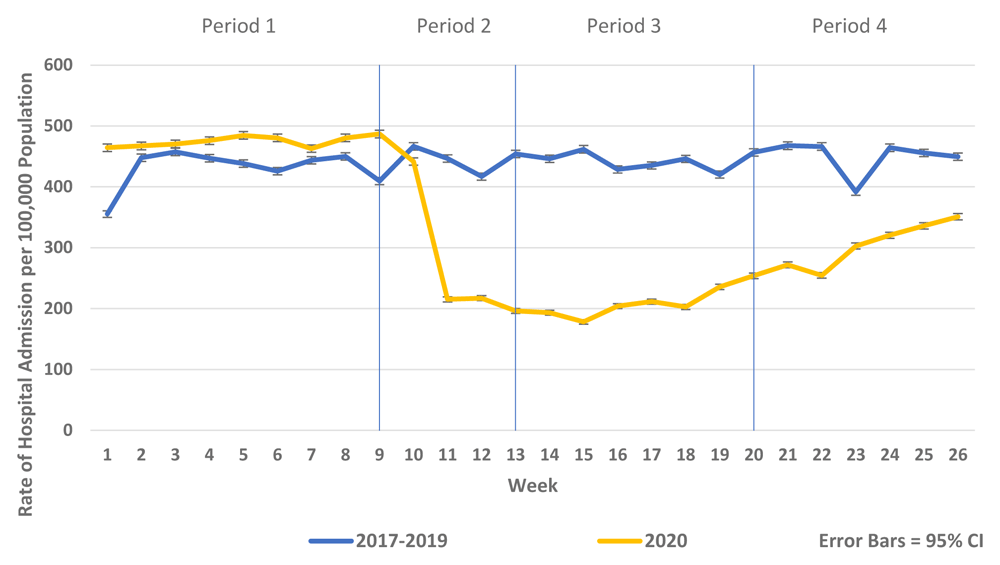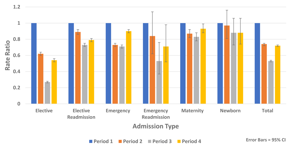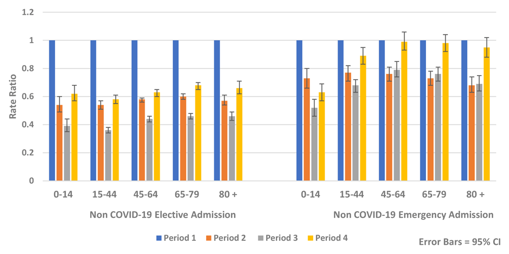 - Overall non-COVID-19 acute hospital admission (Rate Difference -329.5 per 100,00 population, 95% CI, -338.8, -320.2, p-value <0.0001 and Rate Ratio 0.53, 95% CI 0.52, 0.54, p-value <0.0001)
