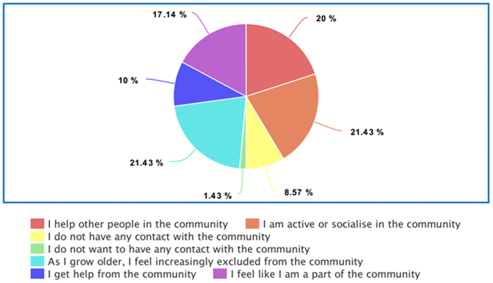 Community participation. The data presented in Figure 1 indicates that there is a strong will and a need for socialization within the older LGBTQI+ community. However, as 21.43% stated “As I grow older, I feel increasingly excluded from the community” and 8.57% stated that they have no contact with the LGBTQI+ community, there is an indication that despite the general desire to be involved with the LGBTQI+ community, older LGBTQI+ adults between 50 and 75 years of age become more isolated from the LGBTQI+ community.