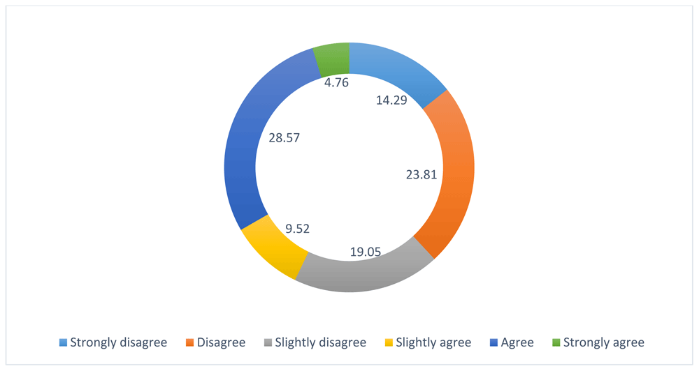 42.86% strongly disagreed with the statement “I feel uncomfortable dealing with health professionals and official organizations where my LGBTQI+ identity is known”. However, different experiences were expressed with regards to the statement “I have to work harder for my concerns to be heard and acted upon by health professionals where my LGBTQI+ identity is known.”- see Figure 4.