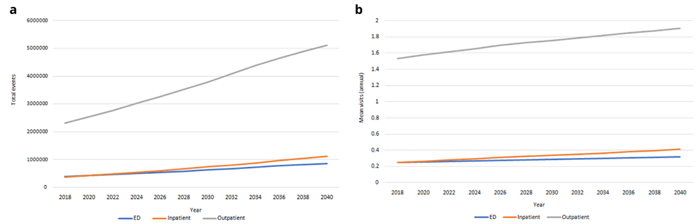 Health care utilisation. Our IFOAM population-level projections for hospital use from 2018-2040 are provided in Figure 10. We estimated there will be more than 850,000 ED admissions for people aged 50+ in 2040; more than 1,100,000 inpatient stays and more than 5,100,000 outpatient appointments. These represent increases of 121%-200% on 2018 levels. This incidence will increase for all groups over time, but at notably slower rates. Increases in Figure 10a are therefore predominantly accounted for by the increasing numbers of people aged 50+, and to some extent by the increasing average age and so higher risk of hospital visits among those older people (these two trends were first illustrated in Figure 1).