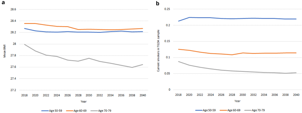 Risk factors. Population-level projections for risk factors from 2018-2040 are provided in Figure 11. In Figure 11a we project a steady decrease in mean BMI in the older population, occurring at a similar rate of decrease for males and females, with mean BMI remaining more or less constant in the younger age bands. In Figure 11b we project decreases in smoking prevalence in the oldest age group and constant smoking prevalence in the youngest age group.
