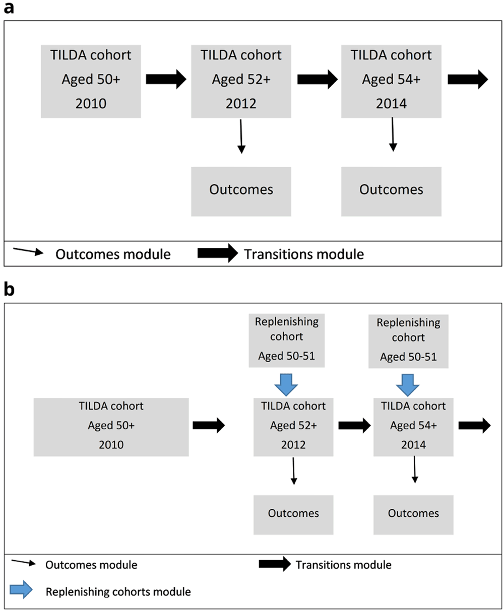 This structure is illustrated in Figure 2, which shows the two different types of simulation. Figure 2a illustrates a cohort simulation. We combined transition probabilities with the characteristics of the stock population to estimate biennial changes in outcome state: mortality, diagnoses, functional limitations, risk factors and health care use. Figure 2b illustrates a population simulation. As well as estimating biennial outcomes in the stock population, the sample was replenished with 50-to-51-year-olds every two years to preserve population representativeness.