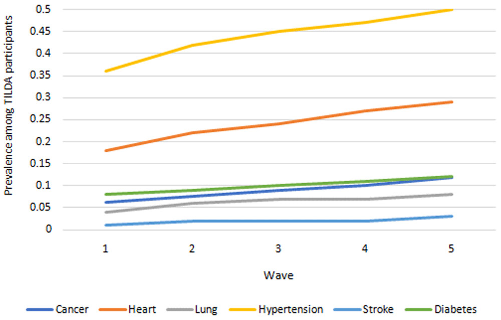 Diagnoses. Prevalences for each of six chronic diseases are presented in Figure 4. Highest prevalence across waves was consistently among hypertension and heart disease, and lowest among stroke and lung disease. Prevalence of all conditions increased over time.