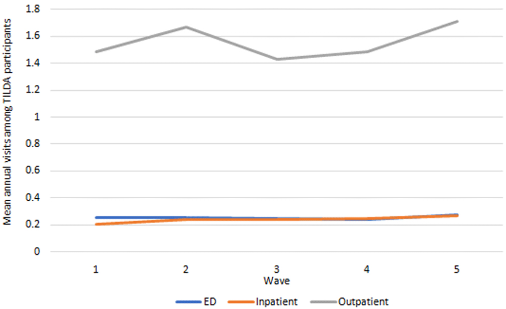 Health care utilisation. Health care use outcomes are presented in Figure 6. Mean hospital visits (ED, outpatient, inpatient) all exhibited small increases between Wave 1 and Wave 5.