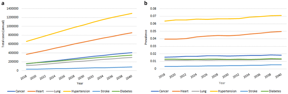Diagnoses. Our IFOAM population-level projections for serious chronic diseases from 2018-2040 are provided in Figure 8a. We estimate that in 2040 there will be more than 400,000 people aged over 50 in Ireland with cancer; over 850,000 with heart disease; approximately 300,000 with lung disease; approximately 1,300,000 with hypertension; more than 80,000 with stroke and approximately 350,000 with diabetes. These represent large proportionate rises in the total number of people with each of the six conditions from 2018, from 96% (hypertension) to 171% (stroke). The corresponding rate of incidence for these diseases is provided in Figure 8b. This incidence increases for all six diseases over time, but at notably slower rates, from 4% (diabetes) to 63% (stroke). The large increases in Figure 8a are therefore predominantly accounted for by the increasing numbers of people aged 50+, and to some extent by the increasing average age and so higher risk of serious disease among those older people (these two trends were first illustrated in Figure 1).
