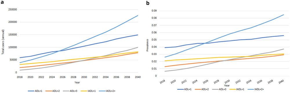 Functional limitations. Our IFOAM population-level projections for functional limitations from 2018-2040 are provided in Figure 9. We estimate that in 2040 there will be more than 635,000 people aged over 50 in Ireland with at least one functional limitation, up from an estimated 160,000 in 2018. These represent large proportionate rises in the total number of people for each group. The corresponding rates of prevalence are provided in Figure 9b. Prevalences will increase for all groups over time, but at slower rates. Increases in Figure 9a are therefore predominantly accounted for by the increasing numbers of people aged 50+, and to some extent by the increasing average age and so higher risk of functional limitations among those older people (these two trends were first illustrated in Figure 1).
