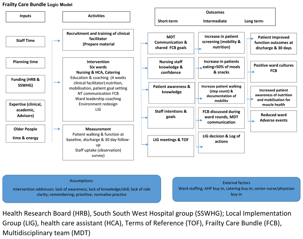 The Frailty Care Bundle (FCB) is a new intervention in that it brings together the evidence-based principles on early mobilisation, enhanced nutrition and increased cognitive engagement into a single bundle of care to prevent hospital associated decline in older patients. It is a hybrid implementation science project with an equal focus on the intervention design, the process of implementation and evaluation of the effect on patient and service outcomes.