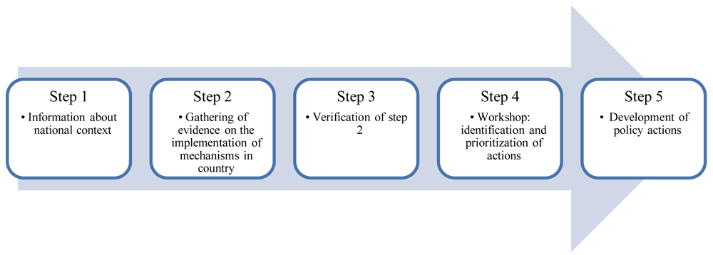 Our evaluation comprises five steps, described below (Figure 1): 1) Gathering information about the national context; 2) Gathering evidence on the implementation of mechanisms by national governments; 3) Verification of step 2 by government officials and policy experts and local public health experts; 4) Identification and prioritization of actions in a workshop; 5) Supporting the translation of findings into policy actions.