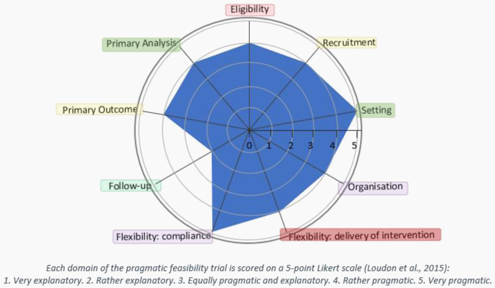 Figure 1. The Pragmatic-Explanatory Continuum Indicator Summary 2 (PRECIS-2) wheel-Music and Movement for Health (Loudon et al., 2015).