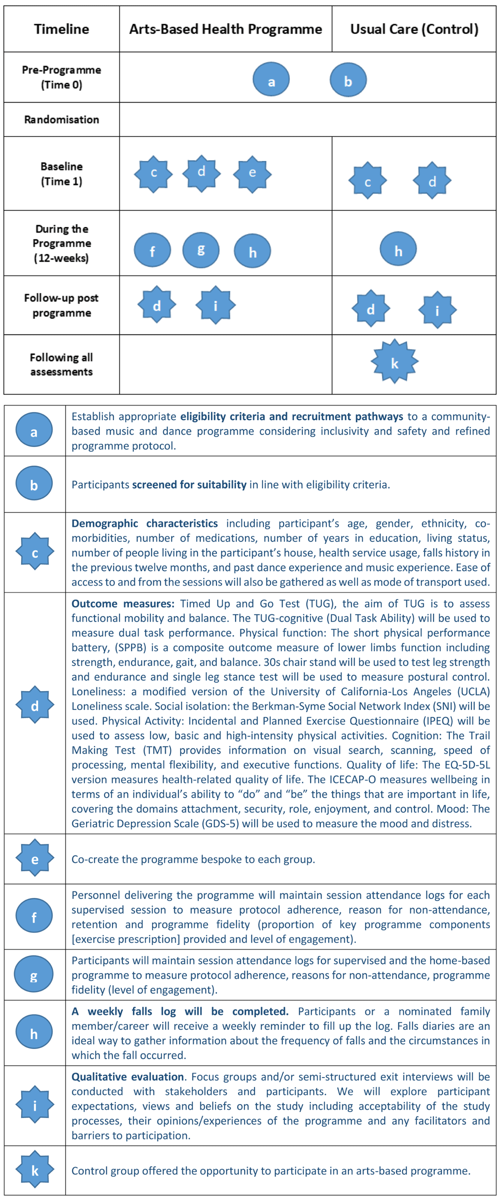 The control group will be a true control usual care comparison group of participants. However, this group will be offered the chance to participate in the arts-based programme for six weeks at the end of data collection if they desire. Participants will be asked to complete a falls log and continue with any usual concomitant care. However, people will be advised not to take up any new physical activity that includes dancing and/or music, which could have a confounding effect on the outcomes of the trial. Individuals will discontinue in the programme if they develop any severe adverse events during the study which may or may not be related to the programme and would affect a participant’s ability to participate in the programme safely (such as chest pain or an injurious fall). In the case of a participant developing a severe adverse event they would require further medical investigation and GP clearance to continue their participation. Participants can also choose to discontinue with the programme at any time for any reason. A summary of the study design can be found in Figure 2.
